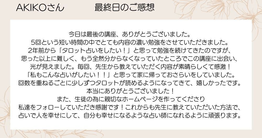 ◆全くの初心者であろうと100%占えるようになることをお約束させていただきます。ご卒業された生徒さんは皆さん、私も驚くほどに、素晴らしい占いをされる素敵なタロット占い師になっておられますのでご安心ください。