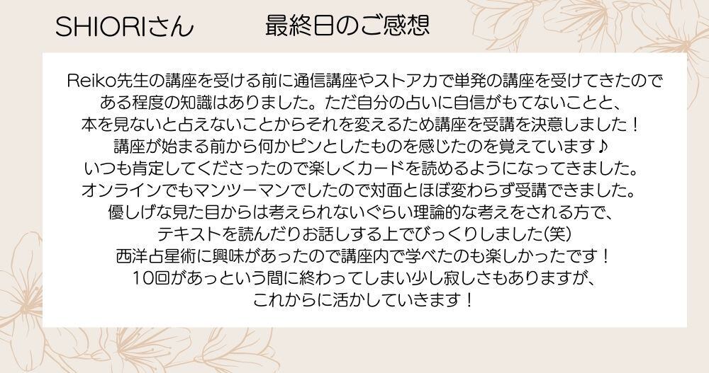 ◆きちんとプログラムに沿って進めばかならず占えるようになります。7回でご卒業された生徒さん全員100%素晴らしい占いをするタロット占い師として巣立っていかれていますのでご安心ください。さらにレッスンをご希望の型は、受講生専用の単発レッスンをお申込みいただけますので是非ご活用ください。